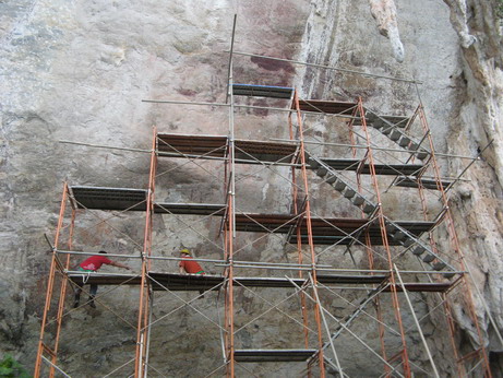 The paintings were found in 1959 but still have not really been researched or documented. And nothing has been done to protect them. Being on a cliff face, they are exposed to the elements such as sun, rain, wind and other environmental damage. Fortunately the paintings are quite high from the ground, so can't be reached by people, hence the need for the large 30' erection !